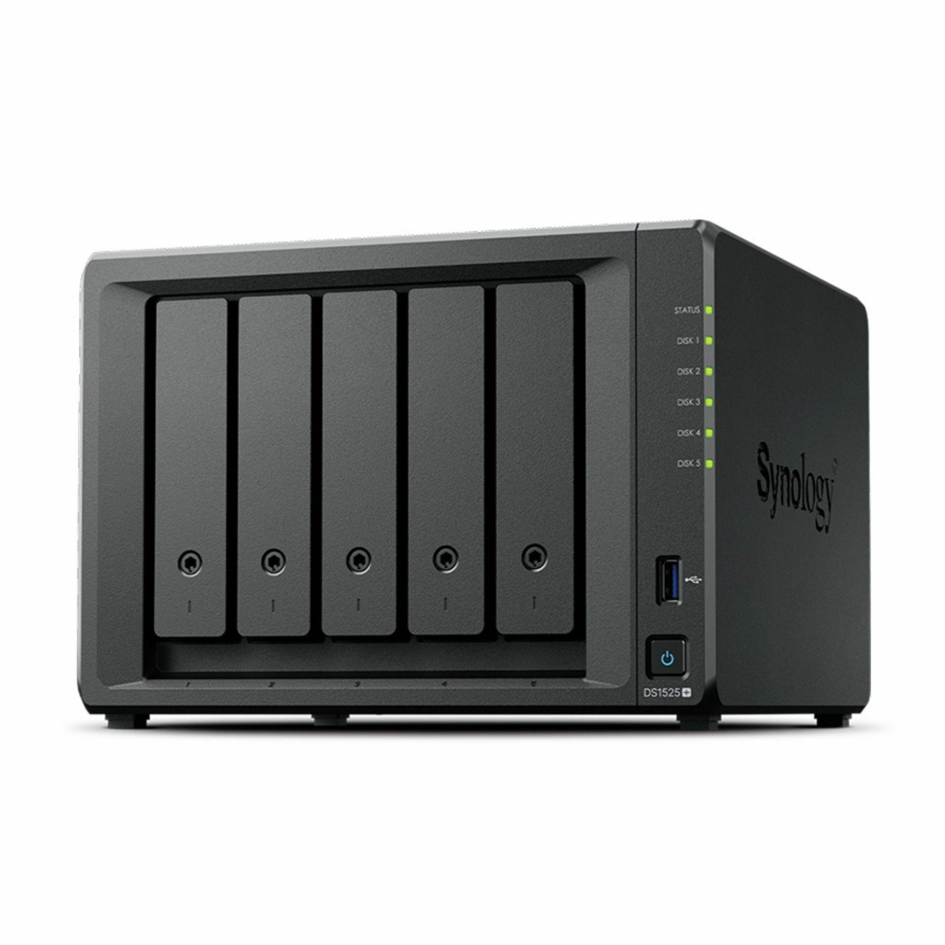 Synology DiskStation DS1525+ je NAS strežnik s petimi režami za 3,5 ali 2,5 palčne SATA diske, 8 GB DDR4 RAM-a, dvema M.2 NVMe režama, dvojedrnim procesorjem z AES-NI ter dvema 2,5GbE vmesnikoma. Podpira razširitev do 15 diskov z enotama DX525.