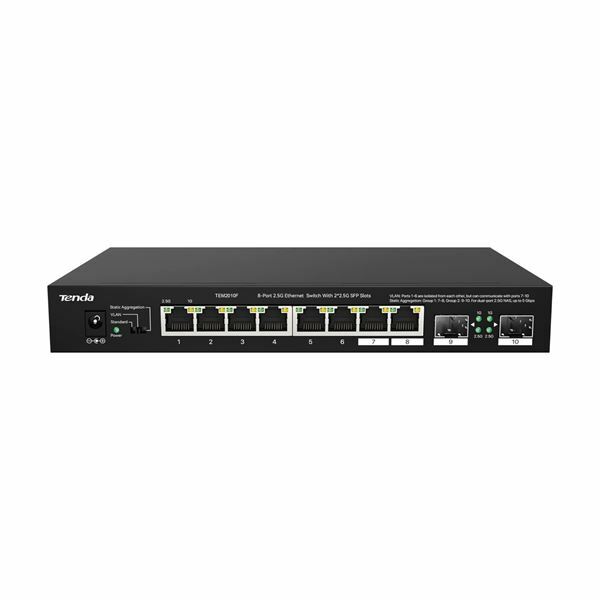 Tenda stikalo TEM2010F ponuja hitrost kar 2,5 gigabitov na vseh osmih portih. V kombinaciji z dvema SFP 2,5Gbps priklopoma zagotavlja hitrejšo prenašanje podatkov in dosega izjemno nizko zakasnitev. Idealna izbira za mala in srednja podjetja, šole, majhne pisarne, za nadgradnjo gigabitnega omrežja.