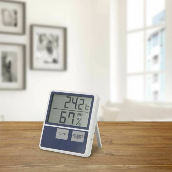 Termometer je zasnovan za merjenje notranje temperature od -10ºC do 50ºC, kot tudi relativna vlažnost od 30% do 90%. Ima velik zaslon z odčitki stopinj Celzija in Fahrenheita (°C/°F). Termometer napaja ena AAA baterija. Možnost postavitve na steno oz. mizo.
