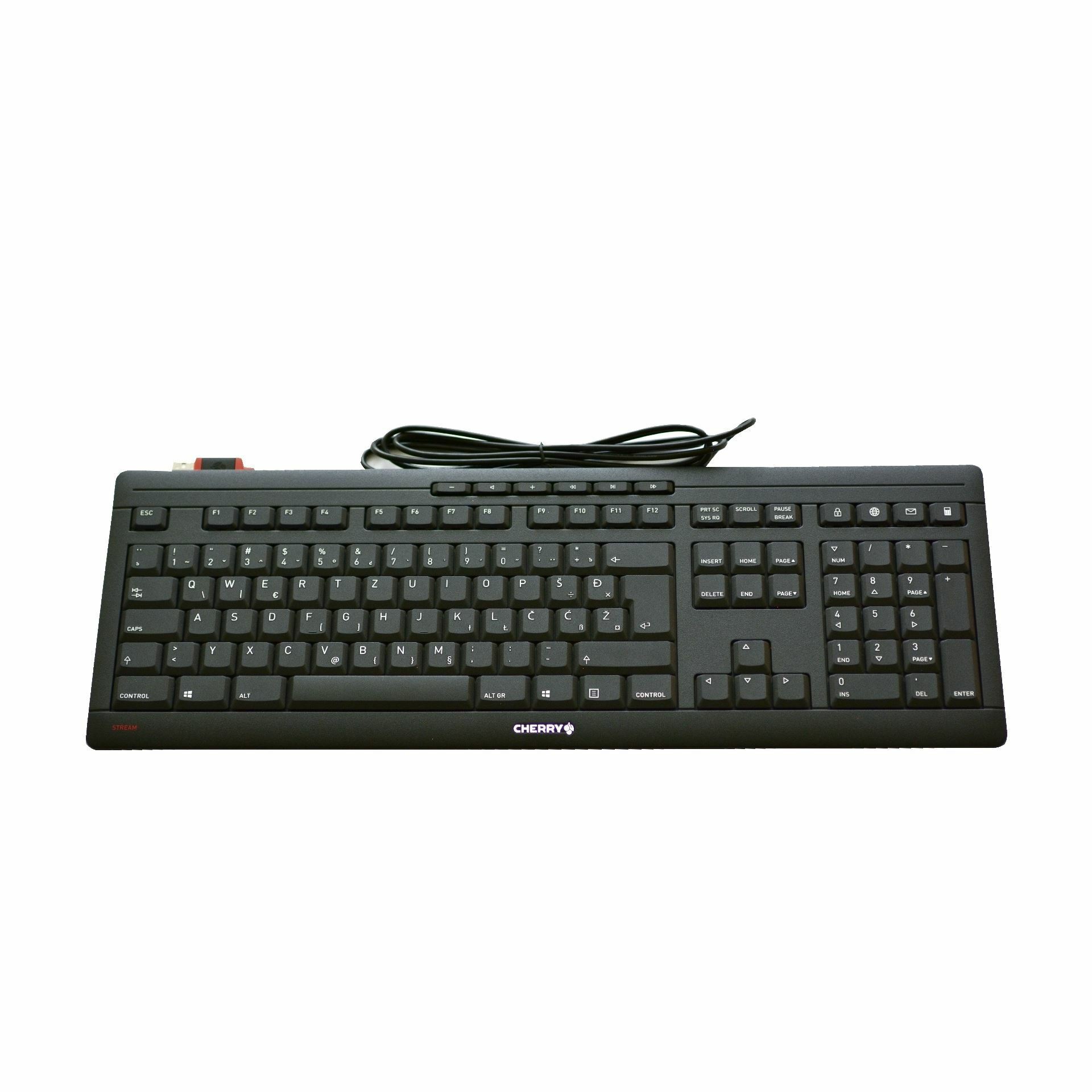 Cherry STREAM je kakovostna tipkovnica, idealna za delo v pisarni. Ponaša se z elegatnim, minimalističnim dizajnom z nizkoprofilnimi tipkami. Te pod seboj skrivajo škarjast mehanizem, ki zagotavlja udobno, natančno in izjemno tiho tipkanje. Tipke CAPS LOCK, NUM in SCROLL LOCK imajo vgrajene tudi rdeče statusne lučke. Na zgornji strani tipkovnice je 6 dodatnih multimedijskih tipk, desno od njih pa še 4 bližnjične tipke za hiter dostop do kalkulatorja, brskalnika in e-pošte ter zaklep računalnika. Cherry STREAM deluje brez nameščanja gonilnikov in zadostuje vsem relevantnim Evropskim direktivam o varstvu zdravja. Ima originalno slovensko razporeditev znakov.