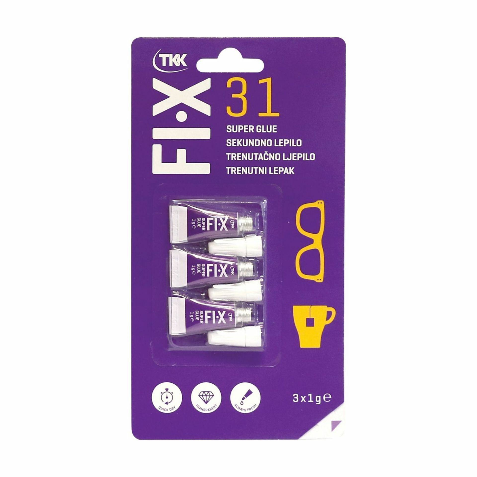 Tekoče sekundno lepilo TKK FIX31 se uporablja za lepljenje porcelana, kovin, umetnih mas, gume, kamna, lesa, usnja in stekla. Lepilo je univerzalno in vodoodporno. Ima takojšnjo visoko moč lepljenja in je transparentno za nevidne spoje. Pakirano 3x 1g.