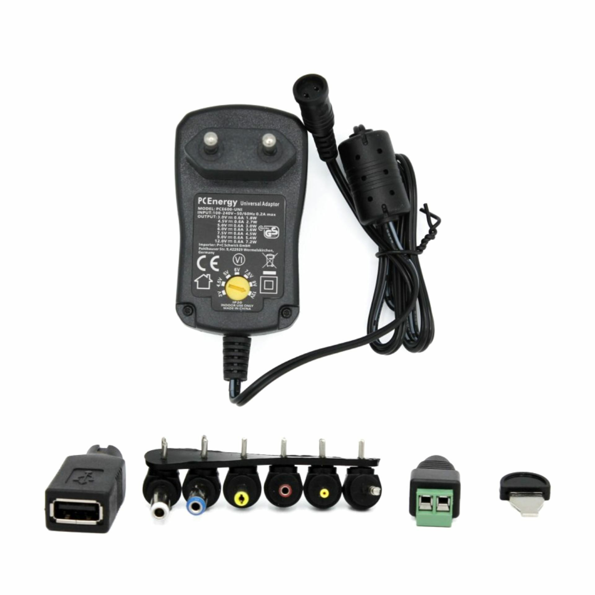 Univerzalni stabilizirani napajalnik 1000mA, priloženi različni standardni napajalni vtikači, izhodna napetost 3 / 4.5 / 5 / 6 / 7.5 / 9 / 12V.