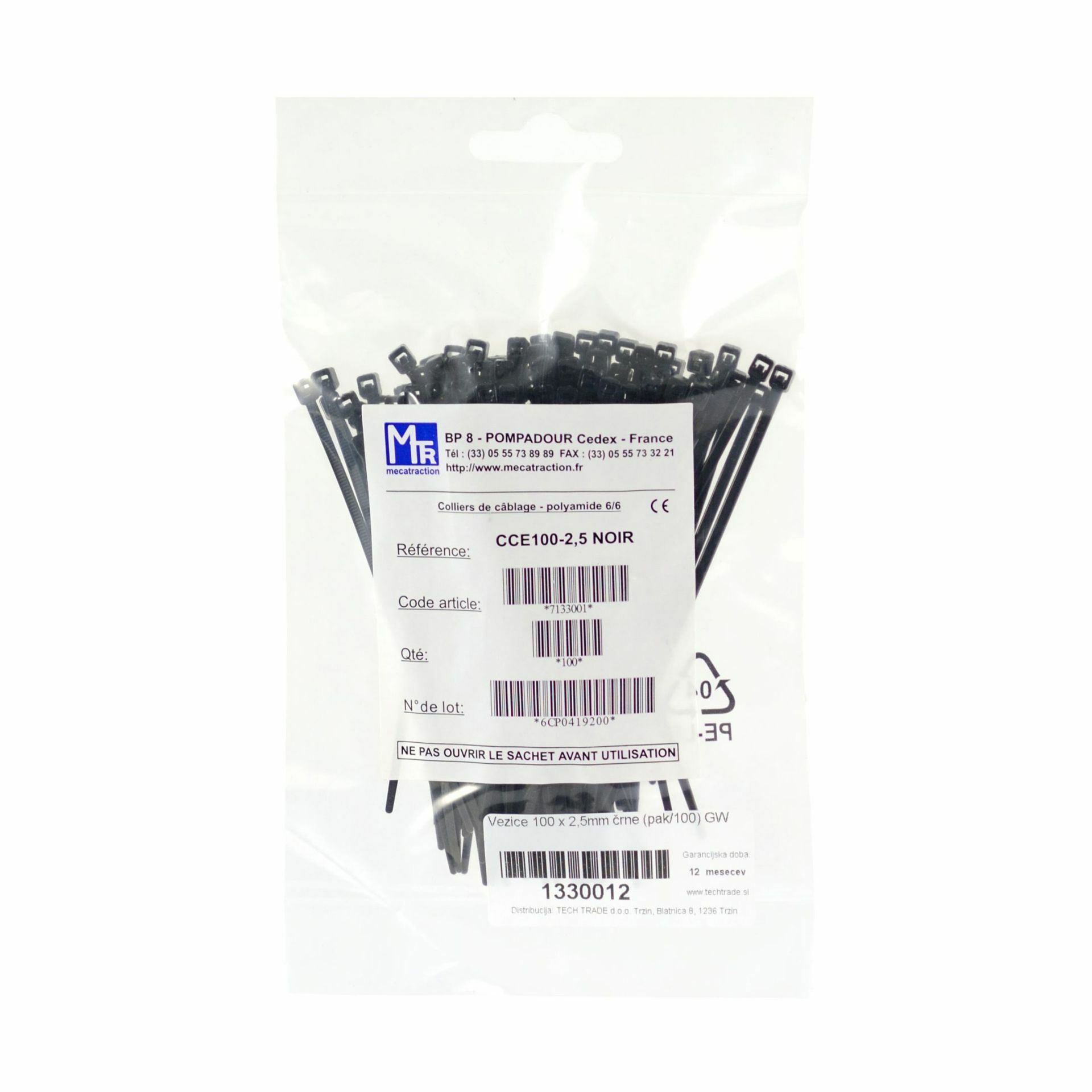 GW vezice za povezovanje in urejanje kablov. V dolžini 100mm in širini 2,5mm, so iz plastičnega materiala in pakirane po 100 kosov. Vezica je črne barve odporna na UV svetlobo in ne vsebuje halogenske in silikonske snovi…