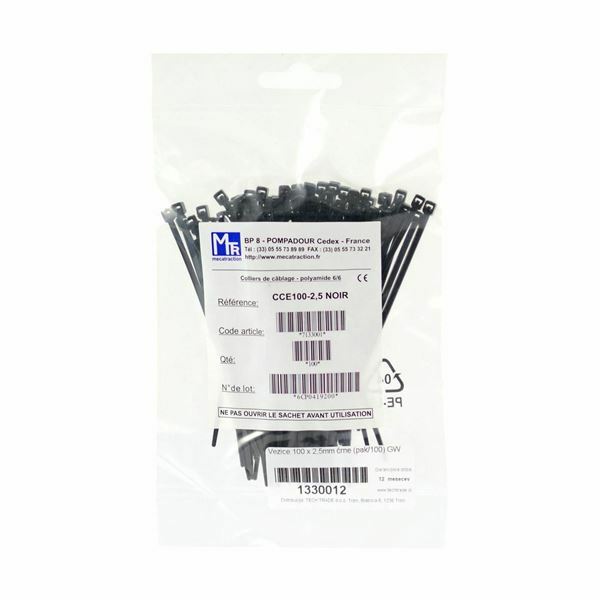 Vezica je izdelana iz poliamida 6.6 kar ji omogoča obstojnost delovanja v temperaturnem razponu od -40°C do +85°C. Dolžina vezice je 100mm širina pa 2,5mm. Njen premer sega do 21mm in prenese največjo natezno trdnost 8,2kg. Vezica je odporna na UV žarke, alkalije, olja, naftne derivate, masti in klorata topila ter ne vsebujeje halogenov in silikonskih snovi. Standard vnetljivosti vezice (UL 94 V-2) dodatno potrjuje njene varnostne standarde. Vsak paket vsebuje 100 kosov. Poleg tega so vezni konci posebej zasnovani za enostavno namestitev.