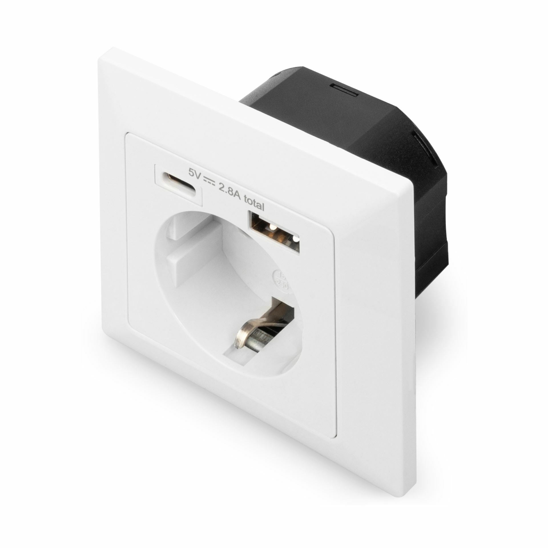 Digitus podometna vtičnica z 220V vtičnico, enim USB tip-A in enim USB tip-C priključkom za polnjenje mobilnih naprav.